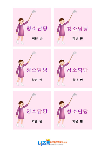 본 서식은 니즈폼(www.nizform.com)을 통해 서비스되는 분류 라벨(청소담당)(6칸)(으)로서, 다운로드 받으신 후, 내용을 수정하거나 입력하여 사용하시면 됩니다.