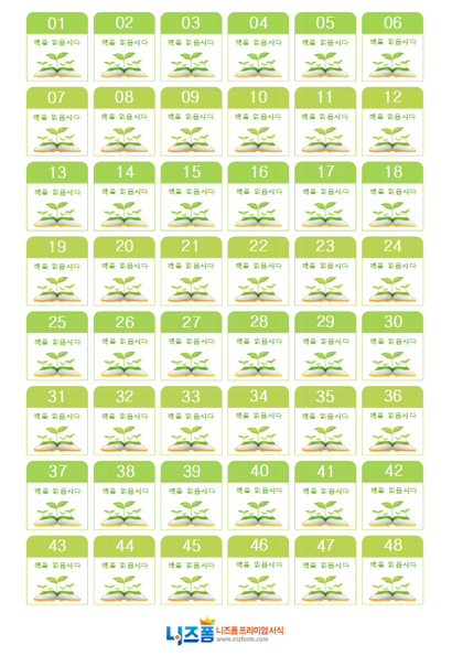 본 서식은 니즈폼(www.nizform.com)을 통해 서비스되는 분류 도서라벨(책 위에 새싹)(54칸)(으)로서, 다운로드 받으신 후, 내용을 수정하거나 입력하여 사용하시면 됩니다.