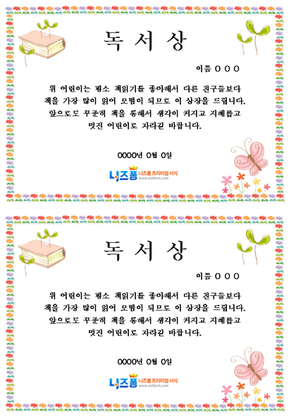 본 서식은 니즈폼(www.nizform.com)을 통해 서비스되는 상장디자인(독서상)(으)로서, 다운로드 받으신 후, 내용을 수정하거나 입력하여 사용하시면 됩니다.