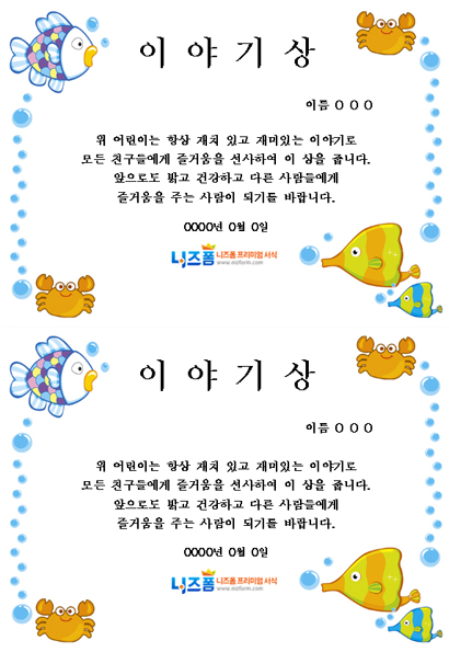 본 서식은 니즈폼(www.nizform.com)을 통해 서비스되는 상장디자인(이야기상)(으)로서, 다운로드 받으신 후, 내용을 수정하거나 입력하여 사용하시면 됩니다.
