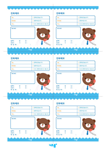 본 콘텐츠는 니즈폼(www.nizform.com)을 통해 서비스되는 메모지(전화메모_전화받는곰)(으)로서, 일반 가정용 프린터로 프린트하여 실선에 맞게 잘라서 사용하시면 됩니다.
