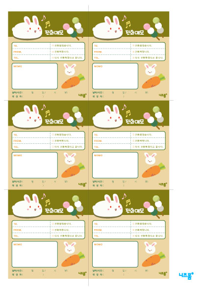 본 콘텐츠는 니즈폼(www.nizform.com)을 통해 서비스되는 메모지(전화메모_토끼)(으)로서, 일반 가정용 프린터로 프린트하여 실선에 맞게 잘라서 사용하시면 됩니다.