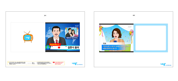 뉴스를 재미있게 패러디한 결혼축하카드로서 완성시 카드 사이즈는 약 13 x 11 cm입니다.
