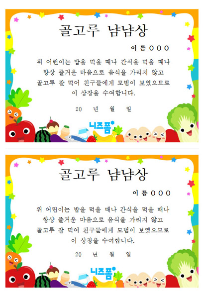 본 콘텐츠는 니즈폼(www.nizform.com)을 통해 서비스되는 어린이집상장_유치원상장(골고루냠냠상)(으)로서, 다운로드 받으신 후, 내용을 수정하거나 입력하여 사용하시면 됩니다.