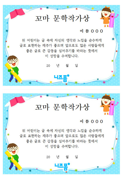 본 콘텐츠는 니즈폼(www.nizform.com)을 통해 서비스되는 어린이집상장_유치원상장(꼬마문학작가상)(으)로서, 다운로드 받으신 후, 내용을 수정하거나 입력하여 사용하시면 됩니다.