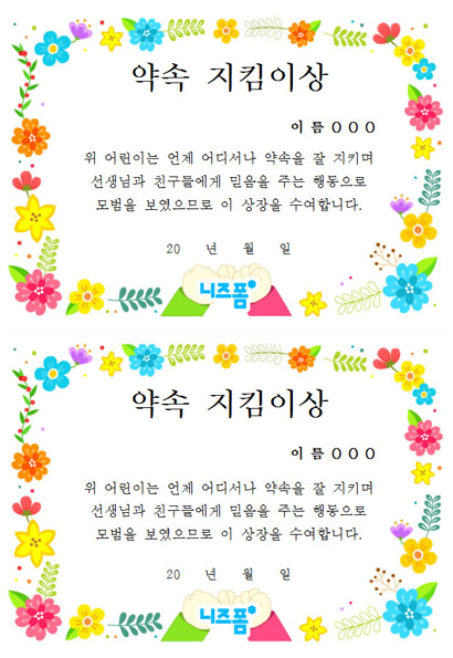 본 콘텐츠는 니즈폼(www.nizform.com)을 통해 서비스되는 어린이집상장_유치원상장(약속지킴이상)(으)로서, 프린트하여 사용하시면 됩니다.