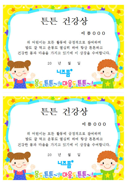 본 콘텐츠는 니즈폼(www.nizform.com)을 통해 서비스되는 어린이집상장_유치원상장(튼튼건강상)(으)로서, 다운로드 받으신 후, 내용을 수정하거나 입력하여 사용하시면 됩니다.