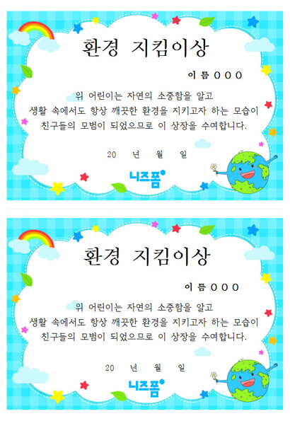 본 콘텐츠는 니즈폼(www.nizform.com)을 통해 서비스되는 어린이집상장_유치원상장(환경지킴이상)(으)로서, 다운로드 받으신 후, 내용을 수정하거나 입력하여 사용하시면 됩니다.