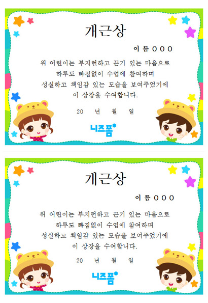 본 콘텐츠는 니즈폼(www.nizform.com)을 통해 서비스되는 어린이집상장_유치원상장(개근상)(으)로서, 다운로드 받으신 후, 내용을 수정하거나 입력하여 사용하시면 됩니다.