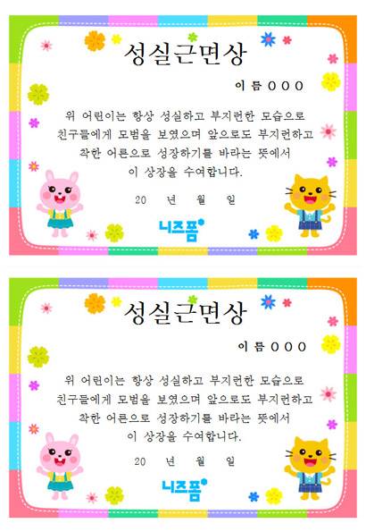 본 콘텐츠는 니즈폼(www.nizform.com)을 통해 서비스되는 어린이집상장_유치원상장(성실근면상)(으)로서, 다운로드 받으신 후, 내용을 수정하거나 입력하여 사용하시면 됩니다.