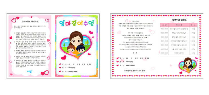 본 콘텐츠는 니즈폼(www.nizform.com)을 통해 서비스되는 부모참여수업초대장(엄마참여수업)으로서, 다운로드 받으신 후, 내용을 수정하거나 입력하여 사용하시면 됩니다.