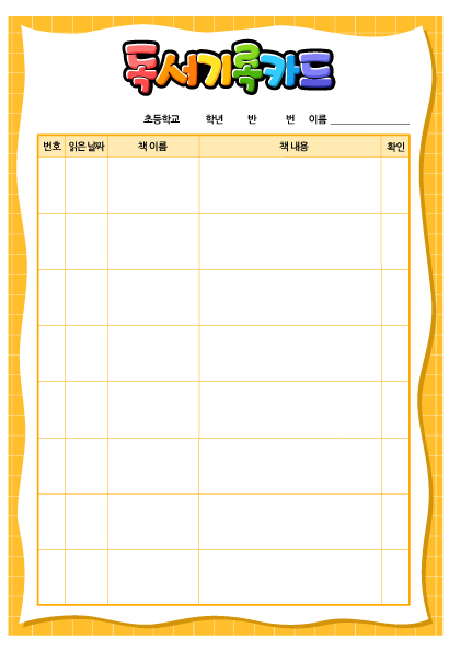 책을 읽은 후, 책 이름과 책 내용을 기록할 수 있는 독서기록카드(노란물결)입니다.