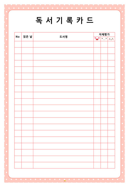 본 서식은 니즈폼(www.nizform.com)을 통해 서비스되는 독서카드_독서기록카드(분홍땡땡이)입니다.
