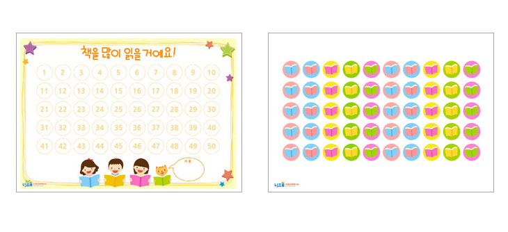 독서스티커판은 일반 A4용지에 프린트하셔서 벽면에 붙여 사용하시거나, 두꺼운 종이를 덧붙여 사용하시면 됩니다.