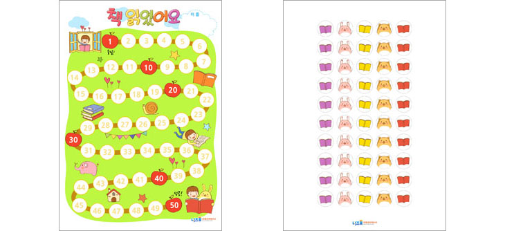 독서스티커판은 일반 A4용지에 프린트하셔서 벽면에 붙여 사용하시거나, 두꺼운 종이를 덧붙여 사용하시면 됩니다.