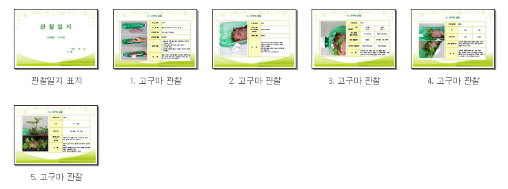 첫번째장은 표지는 목차와 학교, 학년, 이름란으로 구성되어 있으며 각 페이지마다 식물의 변화과정을 담은 사진과 관찰내용을 기입 할 수 있으며, 키우면서 느낀점을 적을 수 있는 소감란이 있습니다.