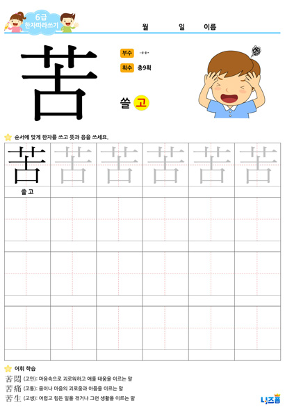 본 서식은 니즈폼(www.nizform.com)을 통해 서비스되는 한자쓰기(苦,쓸 고)입니다.