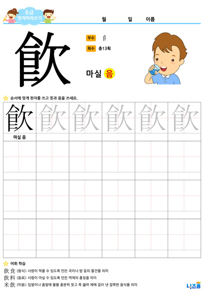 6급한자쓰기(飮,마실 음)