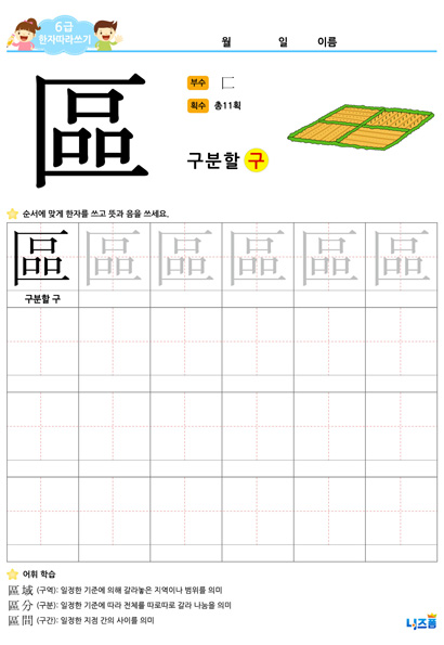 HOME초등학업 > 6급한자쓰기(區,구분할 구)