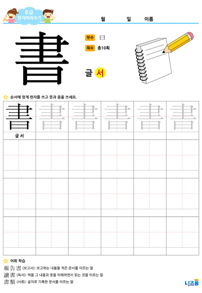 한자쓰기는 6급 배정 한자에 맞게 구성이 되어 있으며,