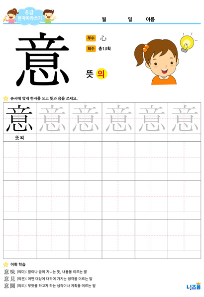 본 서식은 니즈폼(www.nizform.com)을 통해 서비스되는 한자쓰기(意,뜻 의)입니다.