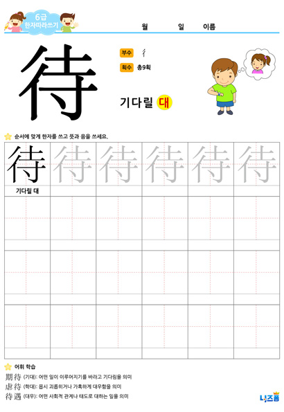 HOME초등학업 > 6급한자쓰기(待,기다릴 대)
