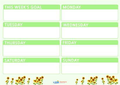 본 서식은 니즈폼(www.nizform.com)을 통해 서비스되는 주간생활계획표_주간계획표(해바라기가로)입니다.