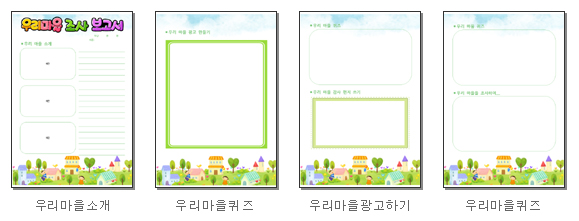 우리마을조사보고서에는 우리마을 소개,우리마을 퀴즈, 감사 편지쓰기,우리마을 광고,우리마을조사보고서를 마치며로 구성되어 있습니다.