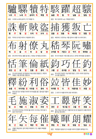 천자문은 총 18장으로 구성되어 있으며 열일곱번째 장입니다. 1장에 56자씩 구성되어 한자급수 시험 준비에 활용 할 수 있습니다.