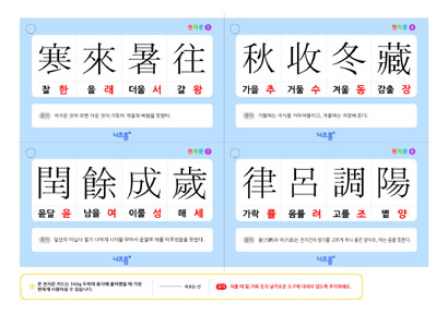 본 천자문 카드는 寒來暑往(한래서왕), 秋收冬藏(추수동장), 閏餘成歲(윤여성세), 玉律呂調陽(율려조양) 사자성어로 구성되어 있습니다.