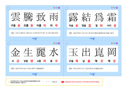 본 천자문 카드는 雲騰致雨(운등치우), 露結爲霜(노결위상), 金生麗水(금생여수), 玉出崑岡(옥출곤강) 사자성어로 구성되어 있습니다.