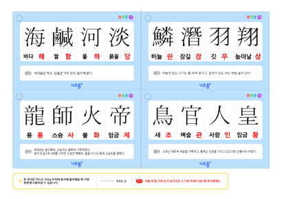 본 천자문 카드는 海鹹河淡(해함하담), 鱗潛羽翔(인잠우상), 龍師火帝(용사화제), 鳥官人皇(조관인황) 사자성어로 구성되어 있습니다.