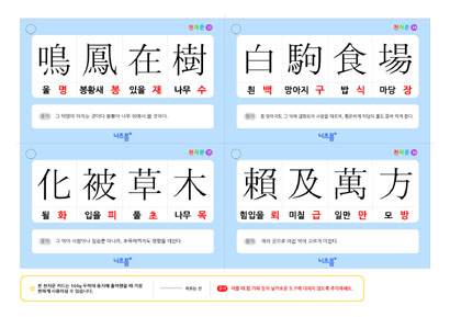본 천자문 카드는 鳴鳳在樹(명봉재수), 白駒食場(백구식장), 化被草木(화피초목), 賴及萬方(뇌급만방) 사자성어로 구성되어 있습니다.
