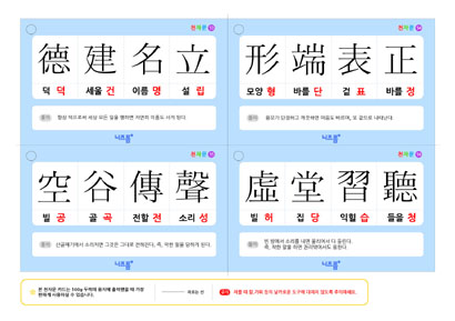 본 천자문 카드는 德建名立(덕건명립), 形端表正(형단표정), 空谷傳聲(공곡전성), 虛堂習聽(허당습청) 사자성어로 구성되어 있습니다.
