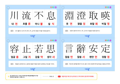 본 천자문 카드는 川流不息(천류불식), 淵澄取映(연징취영), 容止若思(용지약사), 言辭安定(언사안정) 사자성어로 구성되어 있습니다.
