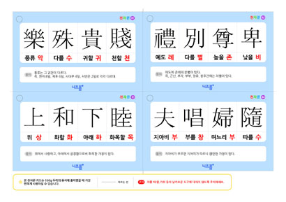 본 천자문 카드는 樂殊貴賤(악수귀천), 禮別尊卑(예별존비), 上和下睦(상화하목), 夫唱婦隨(부창부수) 사자성어로 구성되어 있습니다.