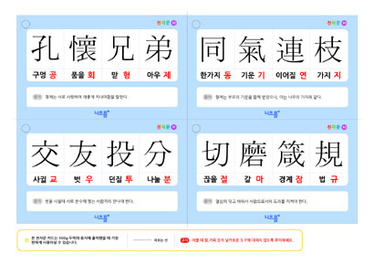 본 천자문 카드는 孔懷兄弟(공회형제), 同氣連枝(동기연지), 交友投分(교우투분), 切磨箴規(절마잠규) 사자성어로 구성되어 있습니다.