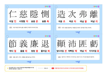 본 천자문 카드는 仁慈隱惻(인자은측), 造次弗離(조차불리), 節義廉退(절의렴퇴), 顚沛匪虧(전패비휴) 사자성어로 구성되어 있습니다.