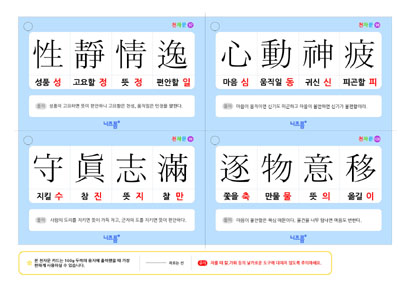 본 천자문 카드는 性靜情逸(성정정일), 心動神疲(심동신피), 守眞志滿(수진지만), 逐物意移(축물의이) 사자성어로 구성되어 있습니다.