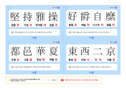 본 천자문 카드는 堅持雅操(견지아조), 好爵自縻(호작자미), 都邑華夏(도읍화하), 東西二京(동서이경) 사자성어로 구성되어 있습니다.