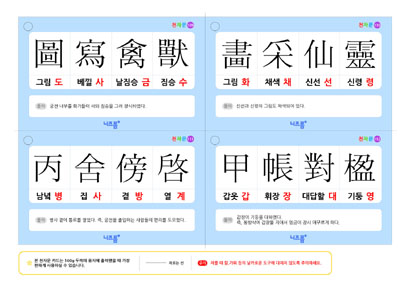 본 천자문 카드는 圖寫禽獸(도사금수), 畵彩仙靈(화채선령), 丙舍傍啓(병사방계), 甲帳對楹(갑장대영) 사자성어로 구성되어 있습니다.