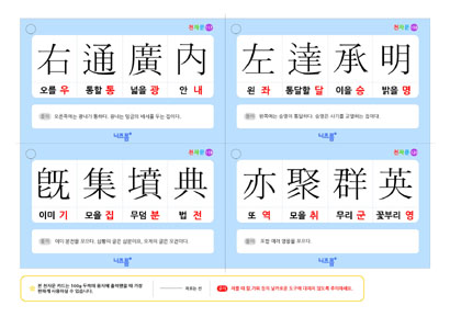 본 천자문 카드는 右通廣內(우통광내), 左達承明(좌달승명), 旣集墳典(기집분전), 亦聚群英(역취군영) 사자성어로 구성되어 있습니다.