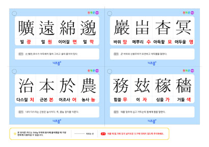본 천자문 카드는 曠遠綿邈(광원면막), 巖岫杳冥(암수묘명), 治本於農(치본어농), 務玆稼穡(무자가색) 사자성어로 구성되어 있습니다.