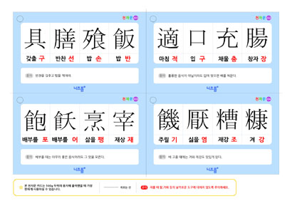 본 천자문 카드는 具膳飡飯(구선손반), 適口充腸(적구충장), 飽飫烹宰(포어팽재), 飢厭糟糠(기염조강) 사자성어로 구성되어 있습니다.