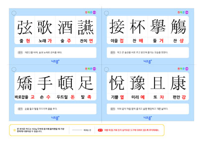 본 천자문 카드는 絃歌酒讌(현가주연), 接杯擧觴(접배거상), 矯手頓足(교수돈족), 悅豫且康(열예차강) 사자성어로 구성되어 있습니다.