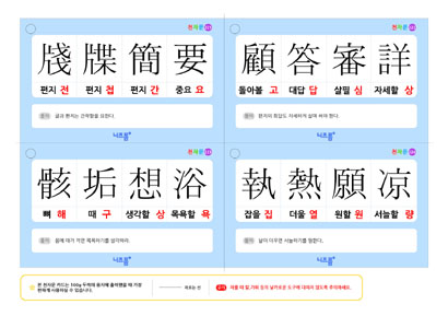 본 천자문 카드는 牋牒簡要(전첩간요), 顧答審詳(고답심상), 骸垢想浴(해구상욕), 執熱願凉(집열원량) 사자성어로 구성되어 있습니다.