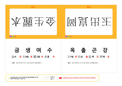 본 천자문 카드는 金生麗水(금생여수), 玉出崑岡(옥출곤강) 사자성어로 구성되어 있습니다.