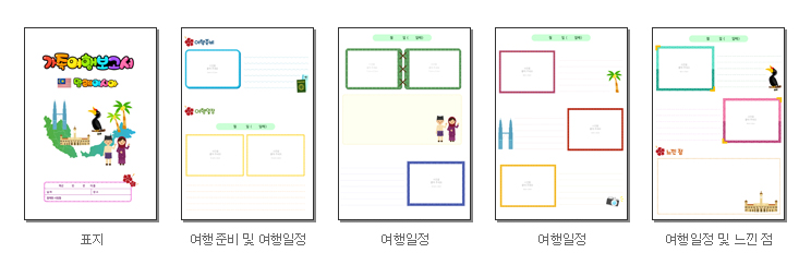 표지, 여행준비, 여행일정, 느낀점을 작성 할 수 있도록 구성되어 있으며, 프린트(A4)되는 장수는 총 5장입니다.
