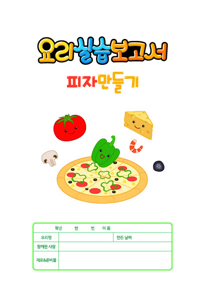 본 콘텐츠는 요리를 하고 난 후, 활동내용을 정리해서 작성할 수 있는 요리실습보고서로서, 요리명, 만든날짜, 함께한 사람, 재료&준비물, 요리하는 모습, 요리 순서 설명, 느낀점으로 구성되어 있습니다.