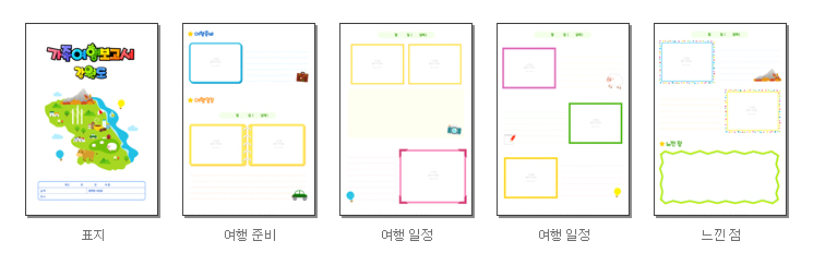 표지, 여행준비, 여행일정, 느낀점을 작성 할 수 있도록 구성되어 있으며, 프린트(A4)되는 장수는 총 5장입니다.
